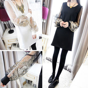 招代銷2014秋季韓版圓領(lǐng)公主針織網(wǎng)紗刺繡燈籠袖長袖打底連衣裙子 /