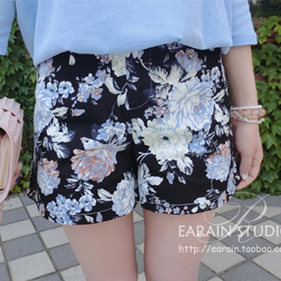 外貿(mào)原單高腰大花印花全棉短褲潮款復古碎花女夏裝顯瘦闊腿褲 /