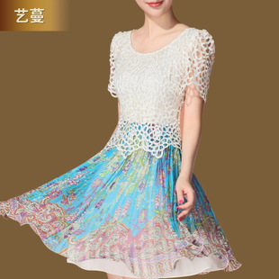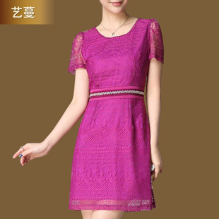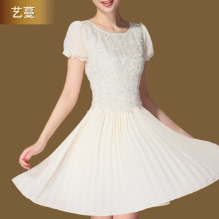 藝蔓2014新款百褶圓領(lǐng)短袖修身蕾絲大擺連衣裙 /