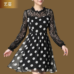 【預(yù)售】藝蔓2014春款印花拼接長(zhǎng)袖泡泡袖蕾絲收腰波點(diǎn)大擺連衣裙 /
