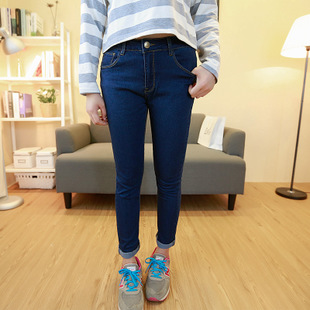 韓國新版胖MM春夏裝 大碼女裝水洗中高腰彈性小腳緊身牛仔褲42044 /