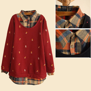 2013韓版秋裝胖MM新款毛衣假兩件 大碼女裝長袖薄款格子襯衫衛(wèi)衣 /