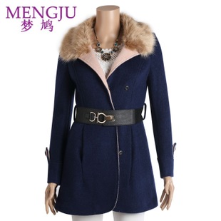 夢鳩冬裝新款 修身中長款長袖暗扣腰帶厚毛呢大衣外套女送毛領 /