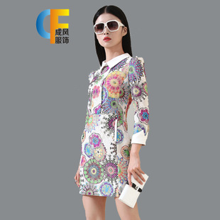 歐洲站 2014早秋款 修身蕾絲印花復(fù)合秋季連衣裙長袖女 /