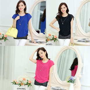 【伙拼】2014新款夏裝女士假兩件雪紡衫 夏季短袖潮圓點大碼上衣 /