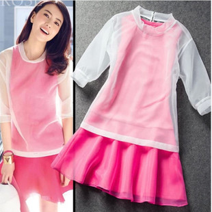 【明星同款】2014春夏女裝新款 粉色魚尾擺背心裙+歐根紗罩衫套裝 /