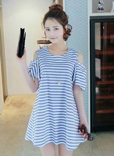 A248 2014韓國新款可愛荷葉袖海軍條紋露肩荷葉袖連衣裙 /