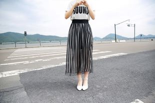 廠家直銷 歐美范夏新款百搭網(wǎng)紗裙黑白豎條紋長裙女 半身裙長裙 /