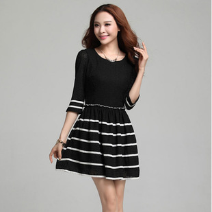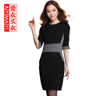 2014新款秋裝 韓版圓領(lǐng)撞色拼接七分袖 時尚修身黑色連衣裙96058 /