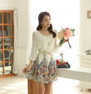 2014新款韓版 修身印花 百褶 雪紡 連衣裙 /