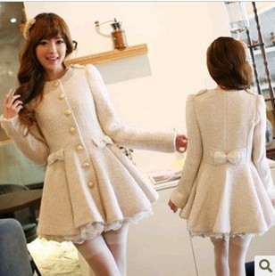 2014冬季新款女裝毛呢外套 韓版修身呢子外套蕾絲圈圈呢子大衣 /