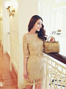 明星同款2014春夏復(fù)古金絲刺繡蕾絲包臀顯瘦7分袖連衣裙 /