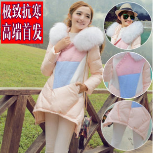 2014韓版拼接毛呢撞色中長款貉子大毛領(lǐng)A版斗篷款寬松羽絨服女潮 /