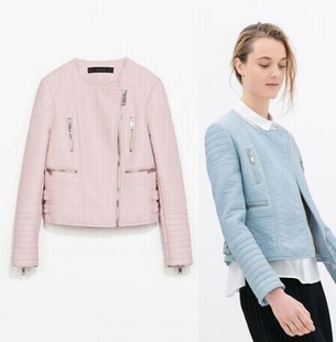 歐美風(fēng)大牌女裝粉色清新PU皮修身機(jī)車皮衣 雙襟短款?yuàn)A克4341/023 /
