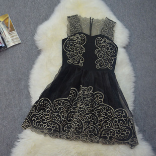 歐美無袖歐根紗勾花精品女人背心裙 雪紡禮服 薄款肩帶連衣裙批發(fā) /