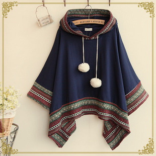 2014新款 森女系 日系 寬松蝙蝠袖 民族拼接連帽斗篷衛(wèi)衣女裝批發(fā) /