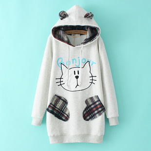 2014秋裝新款女裝日系森女系格子貓咪女式抓絨連帽衛(wèi)衣 /