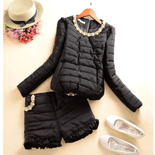 正品特價熱款韓版2014冬裝新款女裝圓領兩件套珍珠短褲棉服棉衣 /