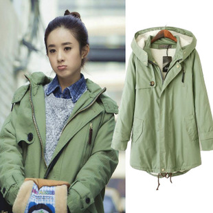 2014冬裝新款 杉杉來了明星同款軍綠色棉服 中長款羊羔絨女式棉衣 /
