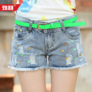 勁羽新款女褲 時尚毛邊破洞牛仔褲歐美顯瘦女夏牛仔短褲批發(fā) /