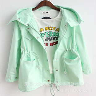 2014秋季新款韓版外套糖果色風(fēng)衣中長款抽繩連帽寬松休閑工裝女 /