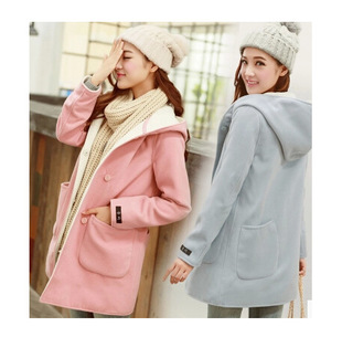 秋冬女裝修身甜美呢子大衣女 韓版加厚連帽中長款學(xué)生羊毛呢外套 /