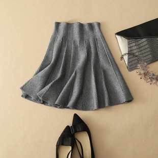 秋冬百搭顯瘦豎條針織蓬蓬裙 羊毛混紡收腰傘裙 歐洲站短裙蓬蓬裙 /