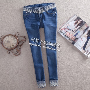 牛仔九分褲 蕾絲翻邊九分褲 中腰女褲 彈力加大碼胖mm九分褲 /