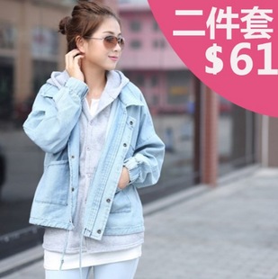 韓版蝙蝠袖短款兩件套 牛仔連帽休閑含內(nèi)膽寬松外套 上衣 /