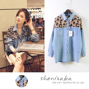 2014韓版女裝 拼接肩部豹紋雪紡寬松大碼長袖牛仔襯衫 612 /