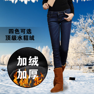 冬季保暖中腰韓版修身加厚加絨女牛仔褲鉛筆褲小腳長褲女式牛仔褲 /