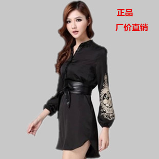 歐洲站女裝 歐美大碼新款立領(lǐng)拼接長袖襯衫 高端刺繡中長女式襯衣 /