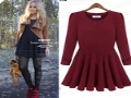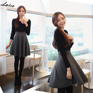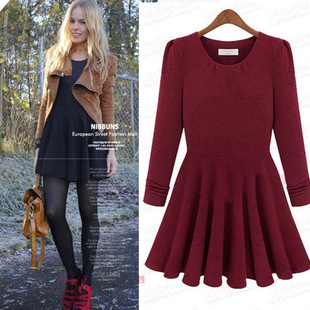 2014秋冬季新款女裝韓版長袖針織打底百褶修身氣質(zhì)純色連衣裙 /