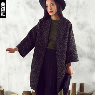 2014冬裝新款時尚顯瘦氣質(zhì)中長款呢子大衣歐洲站加棉豹紋毛呢外套 /