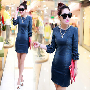 一件代發(fā)新款春裝 時尚韓版修身花瓣袖淺藍色牛仔連衣裙女裝短裙 /