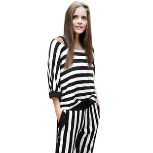 2014新款拼接寬松條紋七分袖T恤上衣長褲套裝兩件套 一件代發(fā) /