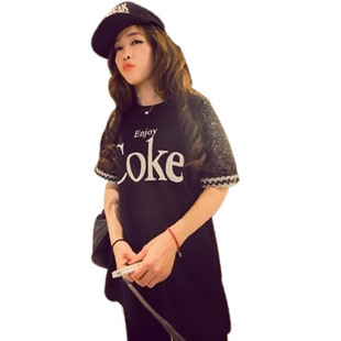 2014潮百搭春夏季新款韓版休閑亮片袖撞色字母印花大版T恤 /