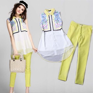 2014【歐洲站】夏裝女裝新款 清爽印花無袖長款襯衫+打底褲套裝 /
