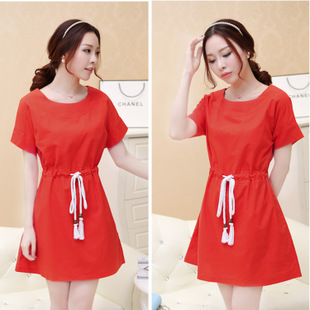 2014新款韓版系帶顯瘦棉麻連衣裙夏 寬松大碼女裝收腰裙女裝批發(fā) /