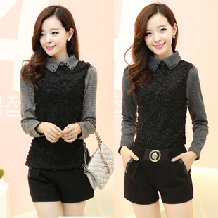 2014秋冬新品假兩件加厚修身娃娃領(lǐng)長袖打底衫套頭襯衫 /
