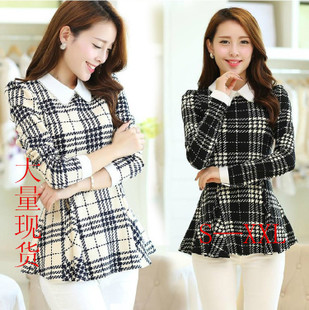 2014春秋潮娃娃領(lǐng)長袖裙擺上衣娃娃衫格子大碼女裝秋季打底衫 /