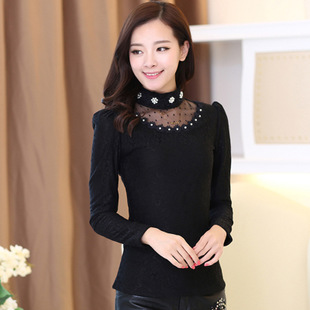 2014秋冬新款韓版高領(lǐng)拼接網(wǎng)紗打底衫 訂珠加絨加厚T恤衫 /