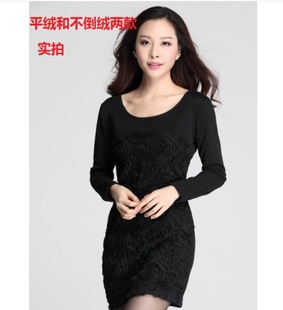 2014玫瑰蕾絲網(wǎng)紗大碼修身包臀裙加絨加厚打底衫女裝長袖T恤長款 /