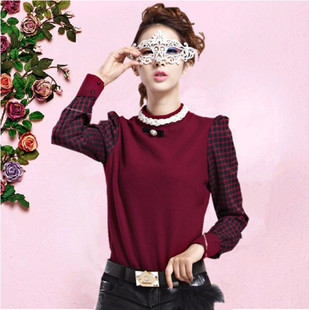 歐洲站2014新款秋冬女裝長袖打底衫立領(lǐng)英倫格子毛呢上衣T恤女潮 /