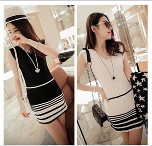 2014夏季新品歐美風黑白條紋修身顯瘦V領(lǐng)針織連衣裙 /