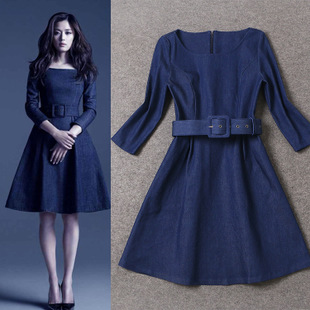【明星同款】2014早秋女裝新款精致剪裁修身腰帶牛仔裙長袖連衣裙 /