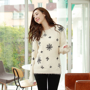 韓版新款圓領(lǐng)毛衣女長(zhǎng)袖套頭修身韓版雪花圖案女裝毛衫 /