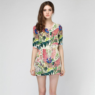 2014歐洲站新款真絲印花束腰 連衣裙批發(fā) /