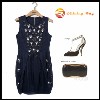 歐美高端女裝重工釘珠黑寶石名媛連衣裙6981深藍 /