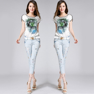 牛仔褲女2015春裝歐洲站新款手工磨破顯瘦牛仔褲女奢華裝飾褲子 /